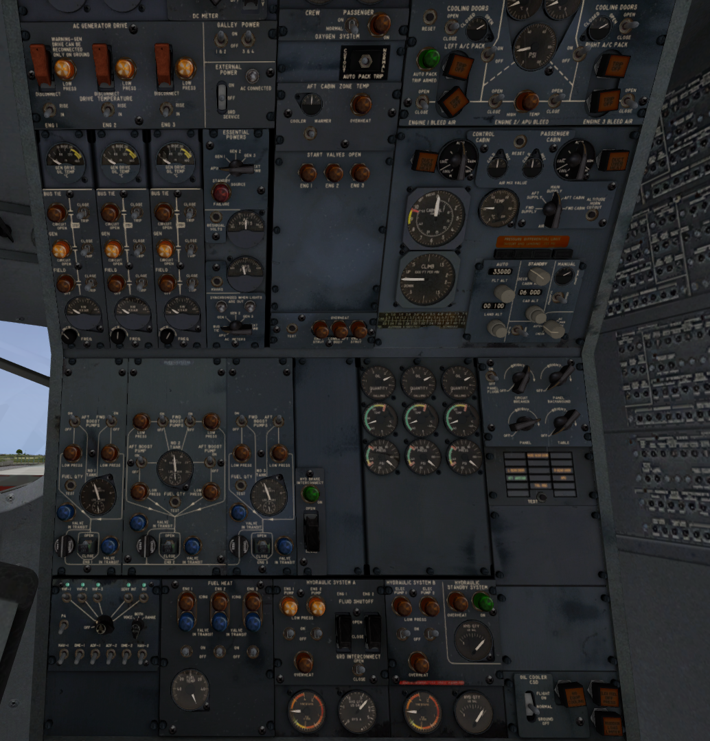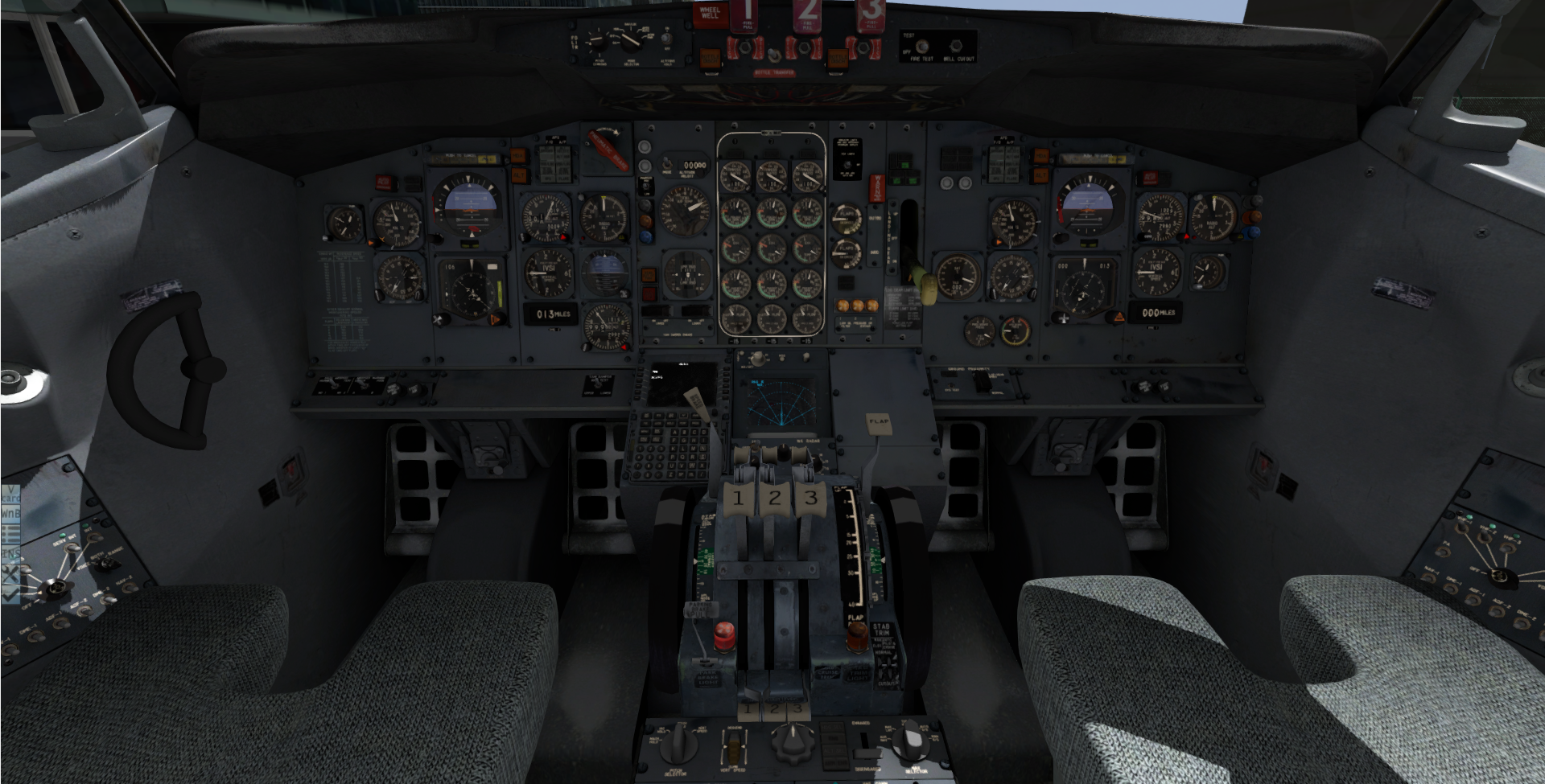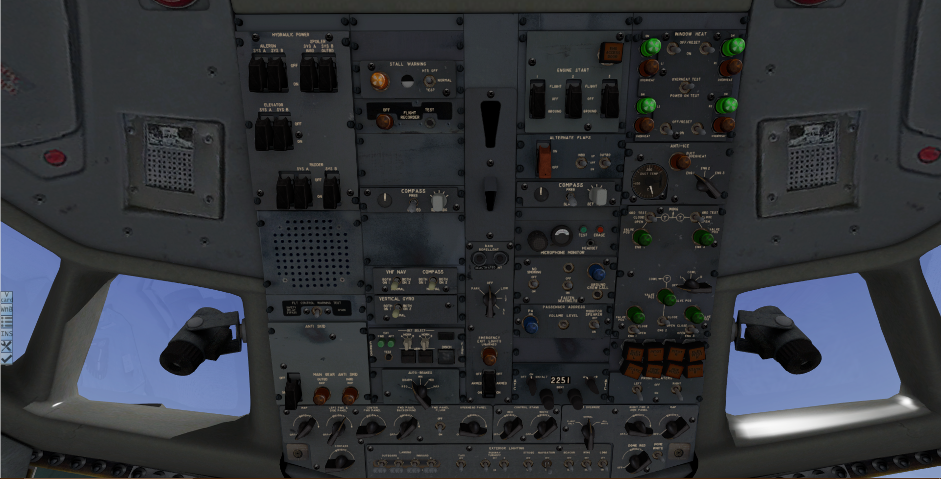 One thing FJS has always done well is the cockpit, and the 727 is no exception. The forward panels look unbelievable, and are properly weathered for a 50-year-old plane. The reflections can be found on every piece of glass on the plane, including instruments such as the radio altimeter and Air temp gauge. The biggest fault I could find was in the shadows of the screws at the bottom of the yaw dampener panel, and this is by no means important. However, as with all of the FJS products so far, a large number of the switches in the cockpit look too generic, and out of place for the 727. An improvement for the future would be to focus more effort onto modelling better switches, as developers such as IEXG have done.