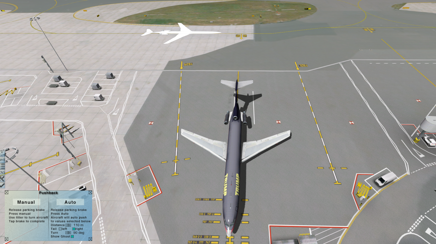 The aircraft does not come with any ground handling trucks. It does however include a pushback system with a “ghost” image, which allows you to see where the plane will push back to. The aircraft does also include GPU and air conditioning truck, although there are no models for them. This causes me annoyance, but can easily be overcome by using JAR ground handling, which includes a truck by default.