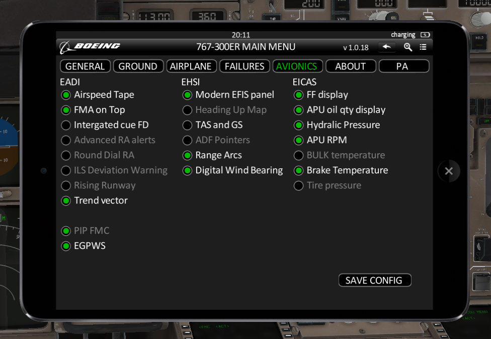 One more screenshot is the avionics tab. This is pretty much the "customer options" page from Boeing as a company orders a 767. Here you can set the company options of the systems and displays.