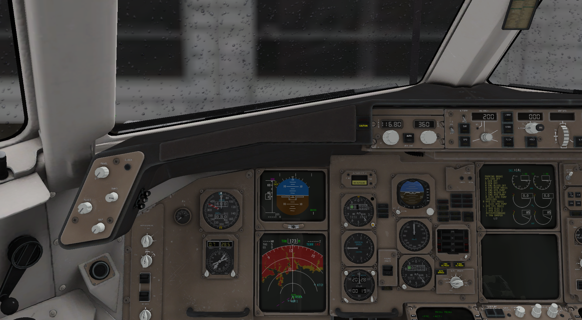Because of the rain, the amount of accumulated raindrops on the windshild is blinding us, so I turn on the wipers. The raindrop and wiper simulation works as well! Now it gives me a reason to turn on wipers in the rain, whereas in FSX/P3D addons, having them on/off doesn't make a different. Well, in X-Plane 10 it does! Note the area below the wipers is clean, while the area above is filled with accumulated raindrops.