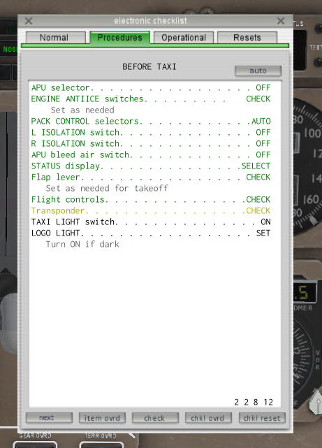 Notice how there’s an “auto” button near the top right – clicking it will automatically complete the checklist and automatically move switches around the cockpit – simulating as if a First Officer just went through that checklist.