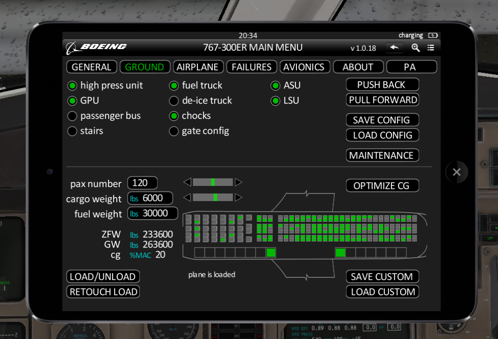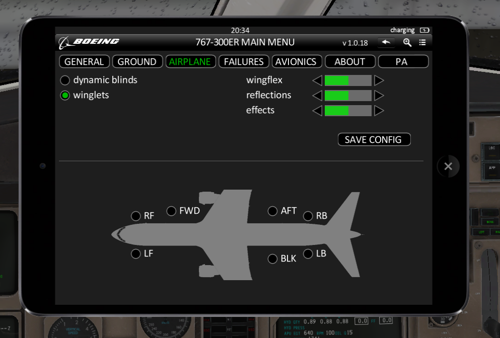 To configure cockpit avionics, turn off dynamic closing window blinds, add/remove winglets… etc, FlightFactor has included a simulated version of an iPad, running a Boeing software that I would assume looks similar to a Boeing iPad EFB.