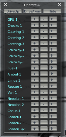 If you wish to only have select vehicles drive up to and service the aircraft, you can select the Control Panel option. This option allows you to control the vehicles you want to drive up to the aircraft and which to drive away. Similarly, you can also select one to hide and it disappears instantly.